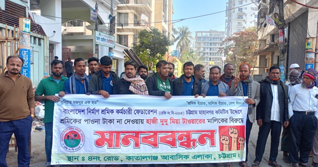 শ্রমিক কাজ সমাপ্তি করার পরে ও শ্রমের টাকার জন্য ধারে ধারে ঘুরতে হচ্ছে কাতলগঞ্জ আবাসিকের দুদুমিয়া টাওয়ারের মালিকের কাছে। বিল্ডিং নির্মান এর চুক্তি অনুয়ায়ী টাকা চাওয়ার জন্য শ্রমিক ফেডারেশন,রেজি নং – ২২০৫ এর সদস্য গাজী মোঃ দেলোয়ার হোসেনের পক্ষ্য থেকে কয়েক বার নোটিশ প্রদান করা হয়।নোটিশ এর কোন জবাব পাওয়া যায় নাই। এক পর্যায়ে উক্ত চুক্তি মোতাবেক কাজ সম্পুর্ন করার পরেও সর্ব শান্ত হয়ে ঠিকাদার দেলোয়ার পথে বসার উপক্রম।থানায় বিভিন্ন সময় বৈঠক করে বাকী ৩৫০০০০০ লক্ষ্য টাকা সীদ্ধান্ত হলে ও দুদু টাওয়ারের মালিক পক্ষ্য টাকা দিতে স্মতি জানায়। কিন্তু পরিশোধের কয়েক বার সময় দিলেও বিভিন্ন অজুহাতে তাল-বাহানা করে টাকা পরিশোধ করেনি । গাজী মোঃ দেলোয়ার হোসেন (৩৮), পিতা: গাজী মোঃ শহীদ উল্লাহ, মাতা : আমেনা বিবি, জাতীয় পরিচয় পত্র নং : (জাতীয় পরিচয় পত্র নাই) , ঠিকানা(স্থায়ী ও বর্তমান)-আলী এইড টাওয়ার ১, গ্রাম-টেক্সটাইল, ইউনিয়ন/ওয়ার্ড নং-২, থানা-বায়েজিদ বোস্তামি, জেলা-চট্টগ্রাম , মোবাইল নং -০১৯১১৬০৯৭৩৮।গাজী মোঃ দেলোয়ার হোসেন জানাইতেছি যে, ০৯/১২/২৫ ইং তারিখ সময় সকাল অনুমান ১০:১০ ঘটিকার কাতলগঞ্জ আবাসিক নামক স্থানে বিবাদী ১. মোজাফ্ফর আহমেদ চৌধুরী (৭০) ২। মোকতার আহমেদ চৌধুরী (৬০) ৩। আক্তার আহমেদ চৌধুরী (৫০) সর্ব পিতা: হাজী দুদু মিয়া সাং ৩১ কাতলগঞ্জ আবাসিক, রোড নং ০৪ থানা: পাচলাইশ জেলা; চট্টগ্রাম গন এর বিল্ডিং নির্মান এর চুক্তি অনুয়ায়ী টাকা চাওয়ার কারনে কথা কাটা কাটি হয় ।এক পর্যায়ে উক্ত বিবাদিগন আমাকে বিভিন্ন ধরনের ভয়াভীতি হুমকি প্রমর্শন করে । পাওনা টাকা চাইতে গেলে আমার পরিবারের সদস্যদের জানে মেরে ফেলবে মর্মে প্রকাশ্যে হুমকী দেয় । সাক্ষী গন সহ স্থানীয় অনেকেই ঘটনা জানে ও শুনে। বিবাদীর বিরুদ্ধে আইনগত ব্যবস্থা গ্রহনের জন্য সাধারণ ডাইরী করা হয়।সাধারণ ডাইরী নং – ১১৪৭ । তারিখঃ ১৫/১২/২০২৫ , সকলের নিকট থেকে ধার দেনা করে এখন শহর ছাড়ার উপক্রম হয়েছে। টাকা আদায়ের জন্য ০৮/০১/২০২৬ইং তারিখে শান্তিপূর্ণ মানব বন্দন করেন শ্রমিক ফেডারেশন,রেজিনং – ২২০৫।
